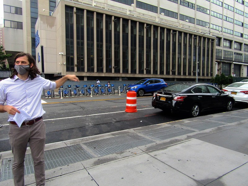 The disregard for bike lanes and crosswalks by vehicles with city placards flouting safety and parking regulations is a danger to us all and has been an issue in Downtown Brooklyn for years, said Levin, as he points to two black cars sitting in the bike lane behind him. “That sign means what it says, ‘No stopping anytime,’ and that’s because this is a bike lane,” said Levin. “You can’t park here. Move your damn car.”