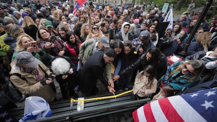 (JNS) – Members of the Jewish community in New York City gathered on Sunday for an unveiling event of a bench in Central Park commemorating the hostages kidnapped into Gaza during the Oct. 7, 2023, attacks on Israel’s south.