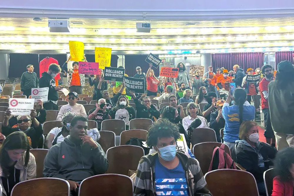 Tenants were pushing for a rent freeze or rollback. Before entering the meeting hall, members of the public attending Wednesday’s vote had to first pass through metal detectors and undergo bag searches after waiting in a line that stretched out of the building and down the block. Once inside, many people chanted “rent rollback” and held up signs calling for the same, while blowing whistles throughout the proceeding and sometimes striking cowbells.