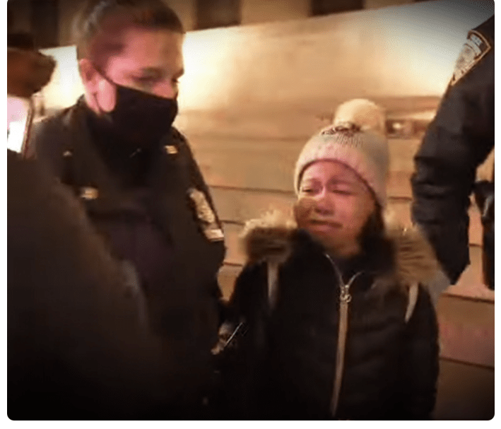 Eventually, NYPD officers arrived and arrested six demonstrators altogether, including a nine-year-old girl named Jayla who cried as police walked her to a squad car.