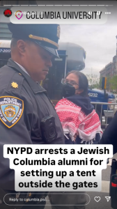 The New York Police Department arrested a keffiyeh-clad Columbia University alumna who set up a tent outside a main campus gate on Monday afternoon. She was engaged in an anti-Israel protest alongside roughly two dozen masked agitators, including about 10 who chained themselves to the entryway.