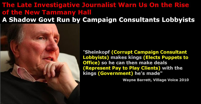 Other lobbyist consultants who stepped into the void and are working for several city council candidates this year include:  Mark Guma Communications, Jonathan Yedin’s Power Play Strategies, Rebecca Katz’s New Deal Strategies, Luis A. Miranda, Jr., and Roberto Ramirez’s Hamilton Campaign Network (the new MirRam Group), Even Stavisky’s Parkside Group, Hank Sheinkopf’s Meridian Strategies.  The late Village Voice investigative reporter Wayne Barrett said in 2010:  Sheinkopf elects Kings (elected officials) so he can eat the Kings Meat (get pay to play patronage for his clients).