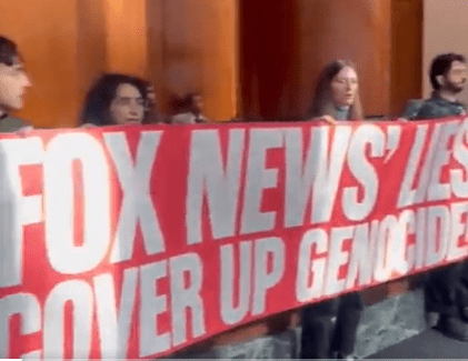 The demonstration extended into the lobby, where protesters sat on the floor surrounded by a combination of NYPD officers and News Corp security personnel. As was noted by the Post report, some demonstrators held a large red sign reading “Fox News… covers up genocide,” apparently referencing coverage of Israel’s actions in Gaza following the brutal October 7th terror attack by Hamas that left over 1200 Israelis and others dead and thousands injured.