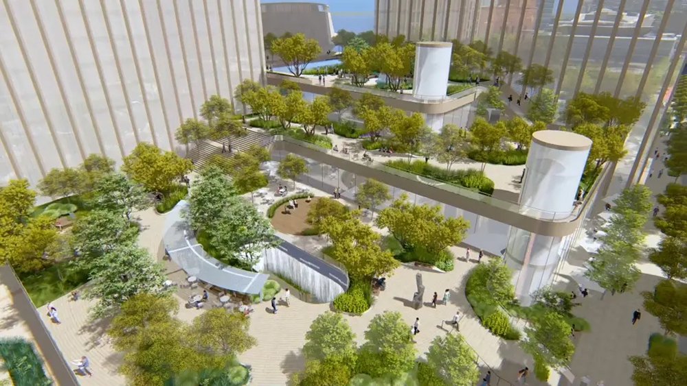 As The NY Post reported, the park is just one part of the broader Freedom Plaza proposal, which includes dual residential towers with over 1,300 units (including 500 affordable), two hotel towers from Mohegan and Banyan Tree, retail and dining options, a daycare center, and a Mohegan-operated casino featuring modern gaming.