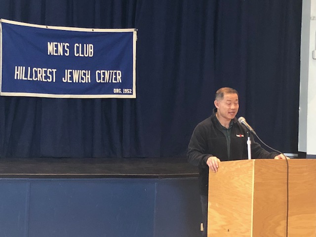 State Senator John Liu spoke last Sunday at a breakfast at Hillcrest Jewish Center.