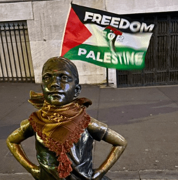 Supporter of Hamas Attack on Israel Adorns NYC’s “Fearless Girl” Statue in Pro-Terror Regalia