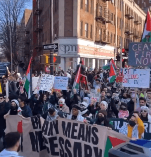 ‘Flood Brooklyn for Gaza’ march from Brooklyn Museum arrives at Barclays, which looks to be at least a thousand.