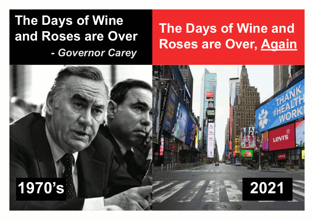 The media did not question the candidates this year on their plans to recover NYC’s economy, or what they would do if the economy does not recover. The media is not connecting the dots to educate New Yorkers on the economic crisis facing New Yorkers, and the heavy cost of the fix as we witnessed during the cuts in services and city jobs in the 1970’s. The media, mayor and governor have not warned New Yorkers like Governor Hugh Carey did during the 1970’s fiscal crisis that the “Days of Wine and Roses are Over.’