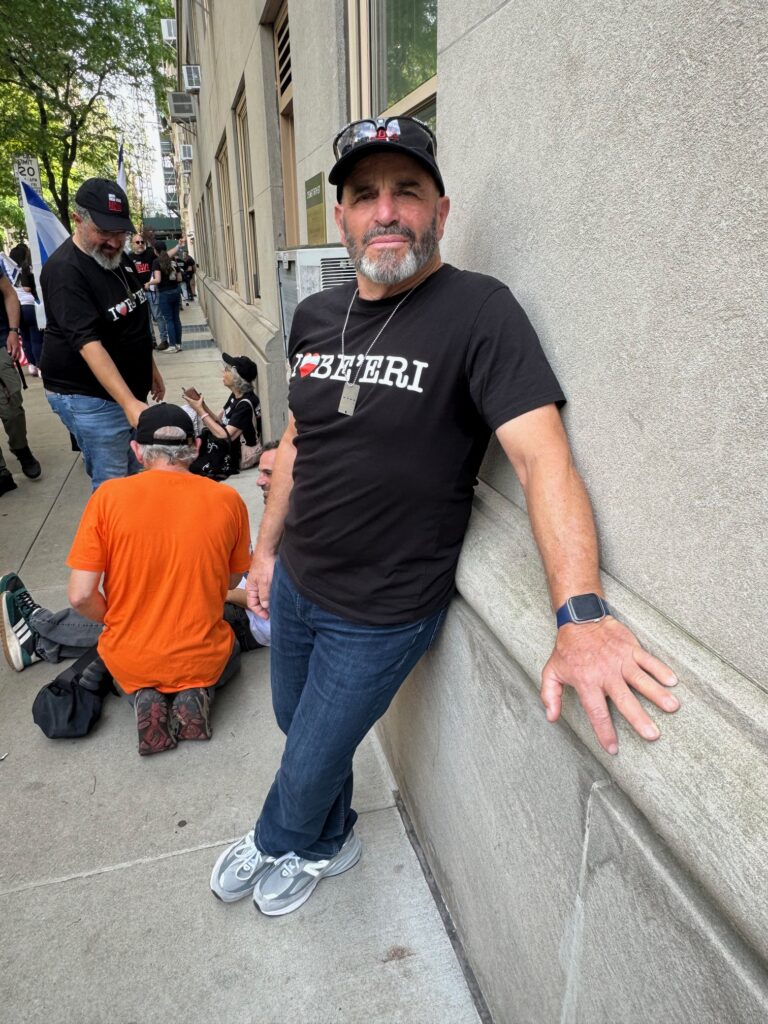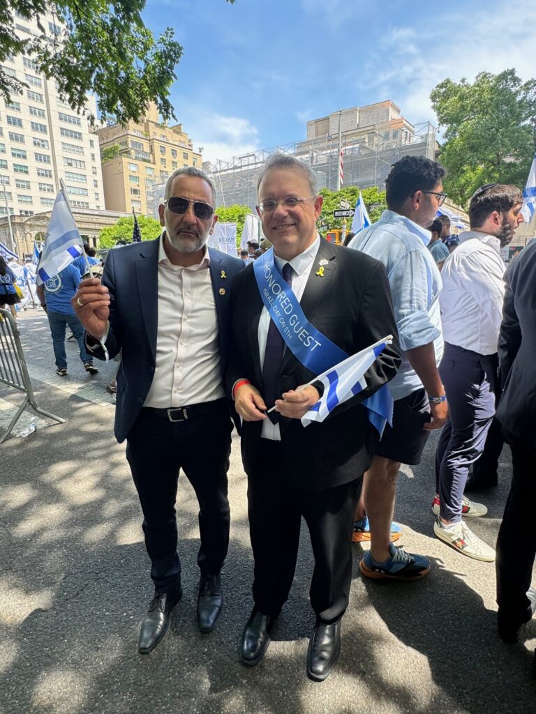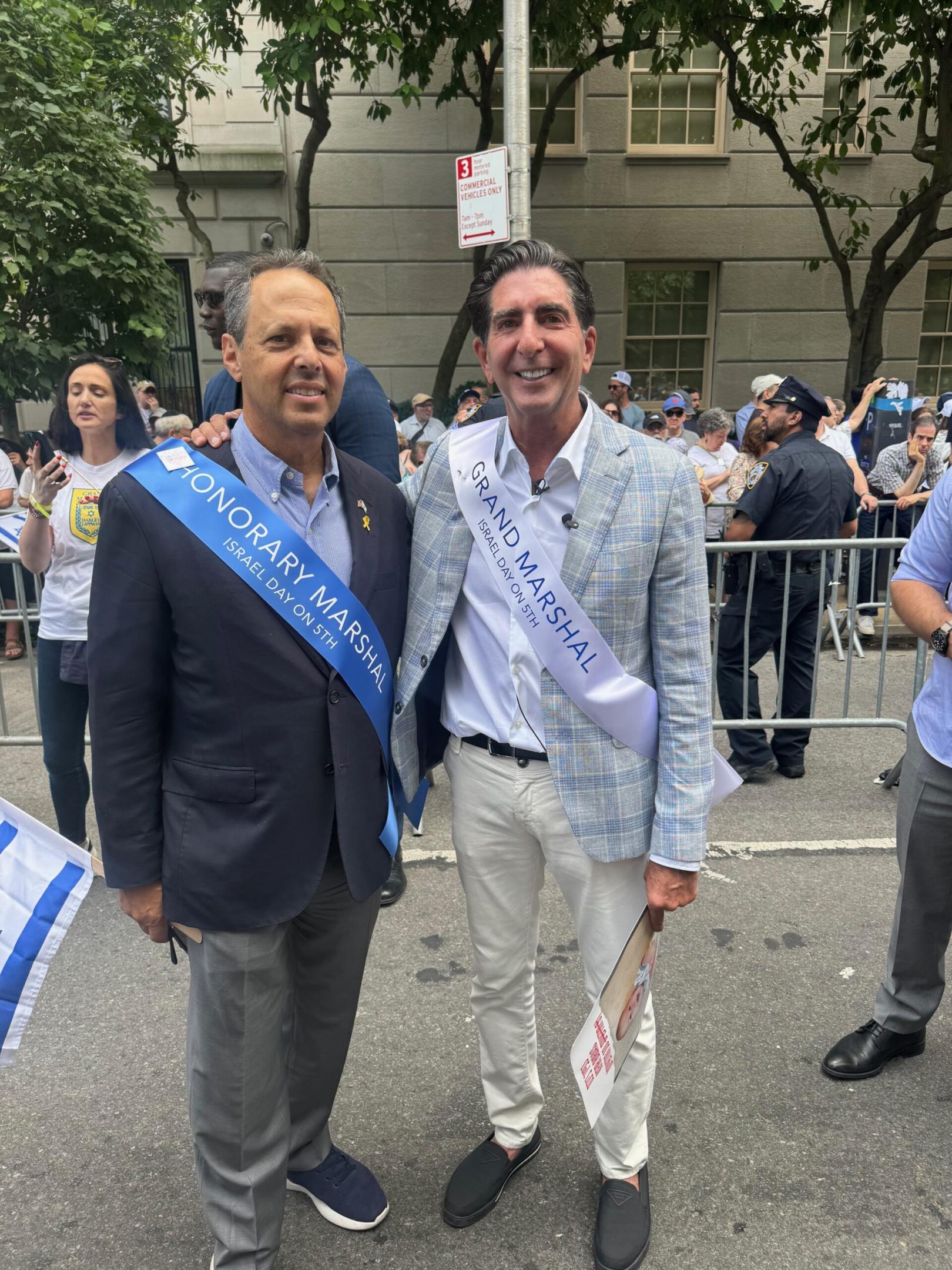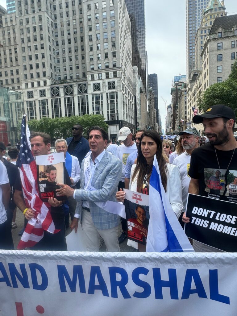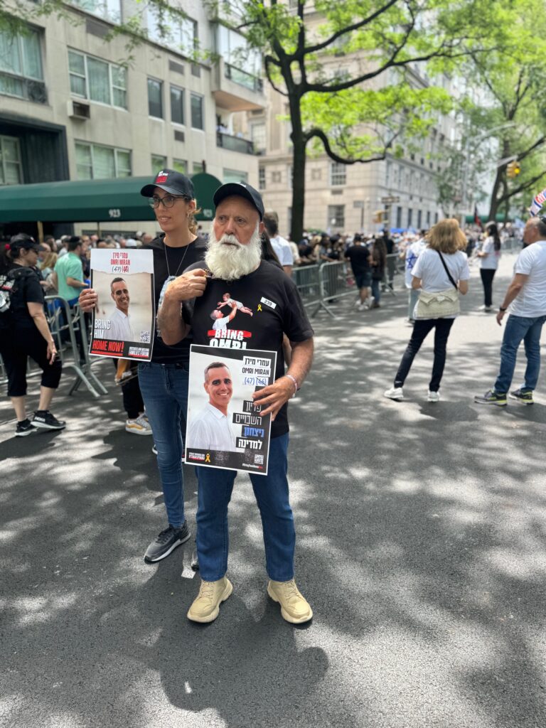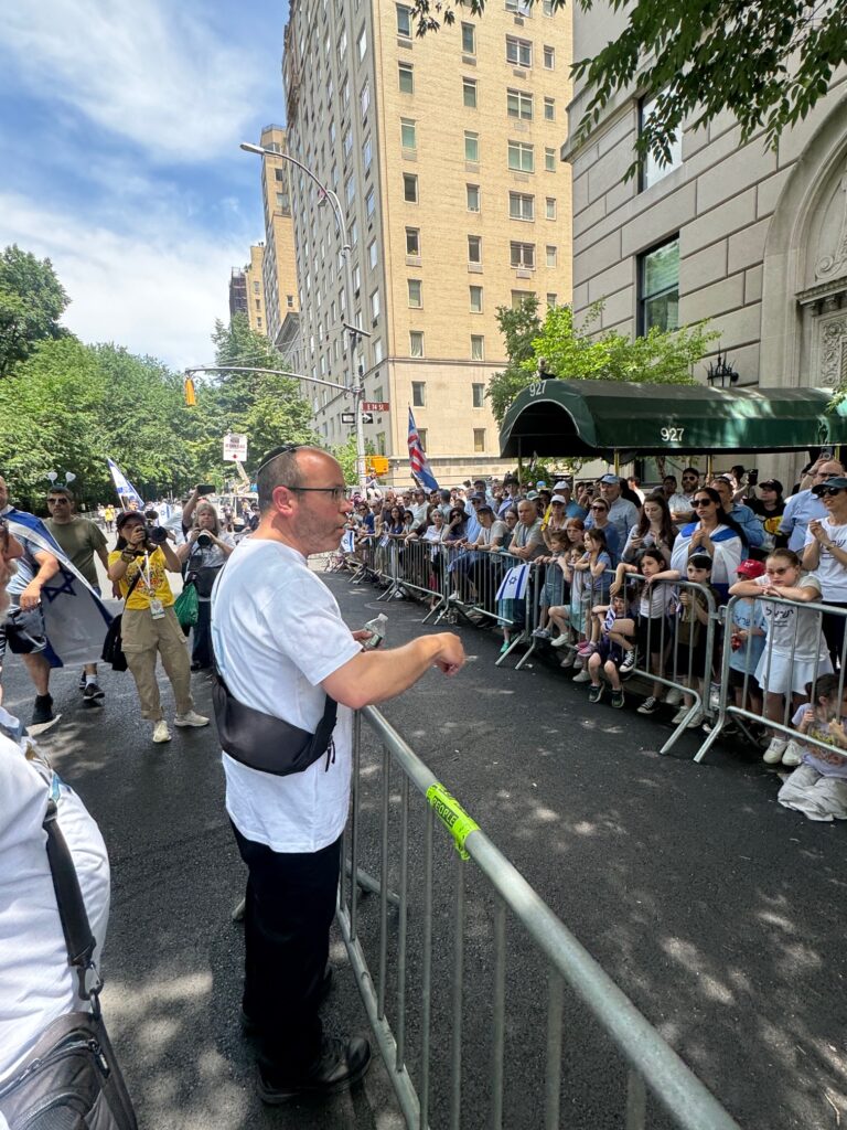 Despite one crazy masked man carrying a sign calling to “kill the hostages now” the parade largely went off without a hitch. As far as I could tell most of the crowd including the schools were orthodox as Ramaz, Moriah, JCRC, HAFTR along with 200 other participating synagogues and schools came out in droves. In fact there seemed to be many more marchers than spectators perhaps due to the closed off streets, the hot weather, and the fear of pro-Palestinian marchers. I had the privilege of accompanying Grand Marshal Harley Lippman on the route-and it was an experience I will never forget. Harley is a diehard lover and advocate of Israel.