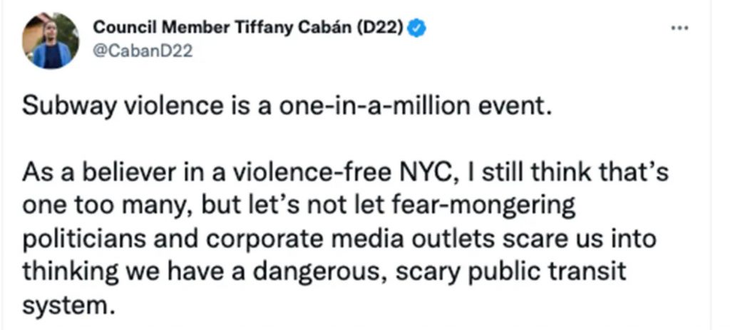 Twitter is beginning to be the place to go, to find out what the media is censuring and what is really going on. The NY Post wrote: “Defund-the-police socialist City Councilwoman Tiffany Cabán tweeted that “Subway violence is a one-in-a-million event” — outraging Elizabeth Gomes who may lose sight in her right eye after being viciously attacked days earlier in the transit system.” “The subway system is dangerous, and for Cabán to post on Twitter something like that — it seems to me that she doesn’t ride the subway or have anyone to ride it. She doesn’t really understand.” Gomes said. Many of the NYC Twitter do: