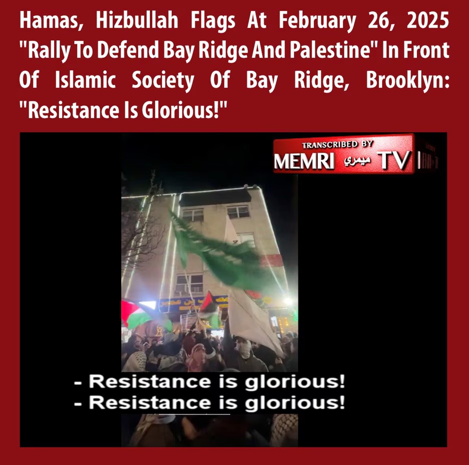 In February 2025, at a rally outside the Islamic Society of Bay Ridge, Brooklyn, demonstrators hoisted Hamas, Hizbullah, and PFLP banners while chanting “They say that Gazans are terrorists – we are all Gazans!” and “Resistance is glorious!” Activist Raja Abdulhaq proclaimed, “Gaza has shown us the way for resistance; we need to reinvent the movement in the West.”