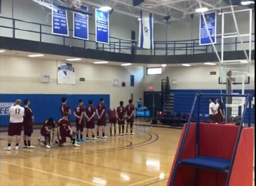 A video of the athletes kneeling on the ground was posted on Facebook by Sarah Serfaty, a Stern College student watching from the stands inside Yeshiva University’s Max Stern Athletic Center.