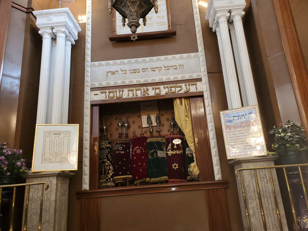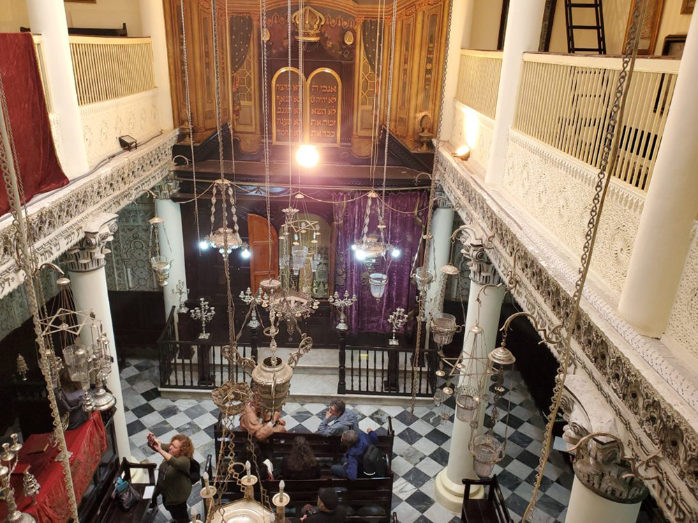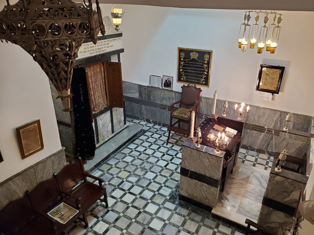 The prayer room is accessible via a small courtyard at the end of the entrance corridor. The inside is well kept, and beautifully decorated with silver candelabras and lamps in an Andalusian style. An impressive wooden Torah ark and panels above it are decorated with Hebrew calligraphy, and many silver chandeliers hanging from the high ceiling were donated by former members to remember their loved ones. The upper gallery is used as an exhibition hall of Jewish relics, showing the community’s Ketubas, tapestries, wedding agreement, handmade embroidery, and also other artifacts used for prayers. Perhaps most remarkable is the Arabic calligraphy repeated in three medallions vertically aligned below the superior lobe. Under this decoration, the lower portion of the wall is lined with rectangular, carved wood panels. The center of the prayer hall opens to a ceiling that is also decorated, with a large skylight in the center. Today this synagogue is only used for celebrations such as anniversaries and bar and bat mitzvahs.