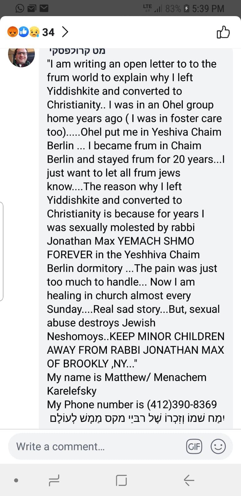 In another post found in another Jewish Facebook Group the suspect explained that he converted to Christianity because of Rabbi Jonathan Max molesting him. Max clearly denies all allegations. According to the NY Post the suspect admits that he is addicted to “drama” and conflict”. The suspect has been described as mentally unstable in various media accounts and by neighbors. He liked attention and liked to threaten to kill himself online to gain it, the Post pointed out.
