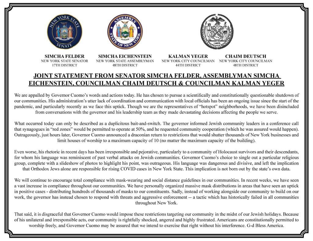 Councilman Kalman Yeger and Heshy Tischler were among those on 13th Avenue in Boro Park tonight slamming the outrageous move by NY Governor Cuomo to limit Shuls to 10 people in COVID-19 hotspots.