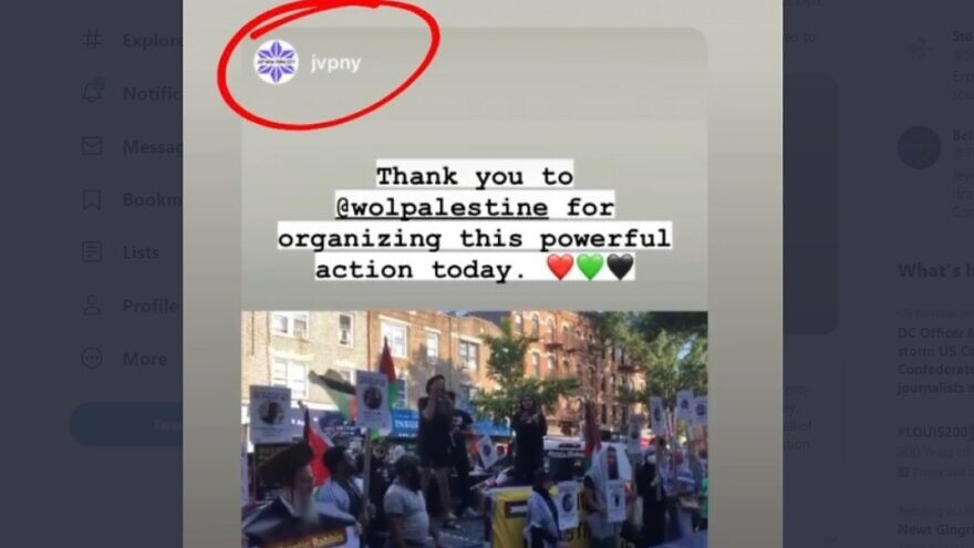 In an Instagram story by StopAntisemitism.org and later shared on Twitter, the New York chapter of JVP posted a photo from the rally on Saturday and thanked the Palestinian-led community organization Within Our Lifetime (WOL) for organizing the “powerful” demonstration.