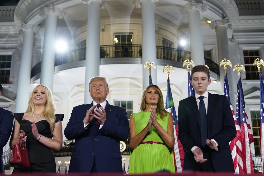 From left, Tiffany Trump, President Donald Trump, first lady Melania Trump and Barron Trump stand on stage on the South Lawn of the White House on the fourth day of the Republican National Convention, Thursday, Aug. 27, 2020, in Washington. (AP Photo/Evan Vucci)