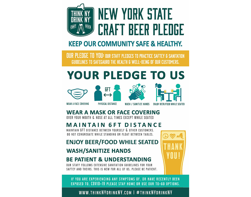 The New York State Brewers Association (NYSBA) is encouraging consumers to do their part in making the reopening of breweries a success by taking the New York State Craft Beer Pledge. The pledge reinforces safety and sanitation guidelines and asks consumers to be patient and understanding as brewery owners and staff adapt to the new operating procedures.