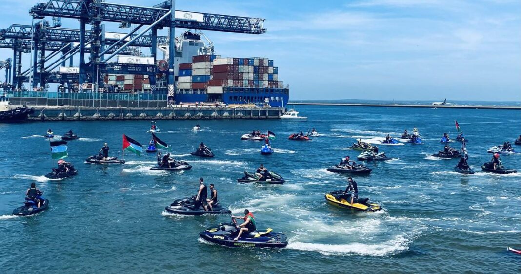 A child was seen carrying a sign “smash the Israeli terror state” on a jet ski in the water at Port Botany, followed by a police boat.
