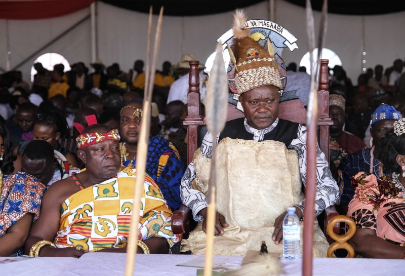 Jude Mike Mudoma_Umukuuka iii, right, and King Fiti Torgbi Amenya V, Paramount Chief of the Alfapo Traditional Area, left, from Ghana, attend the launch of the circumcision season, known as Imbalu, in Mbale Village, Eastern Uganda, Saturday, Aug. 3, 2024. (AP Photo/Hajarah Nalwadda)