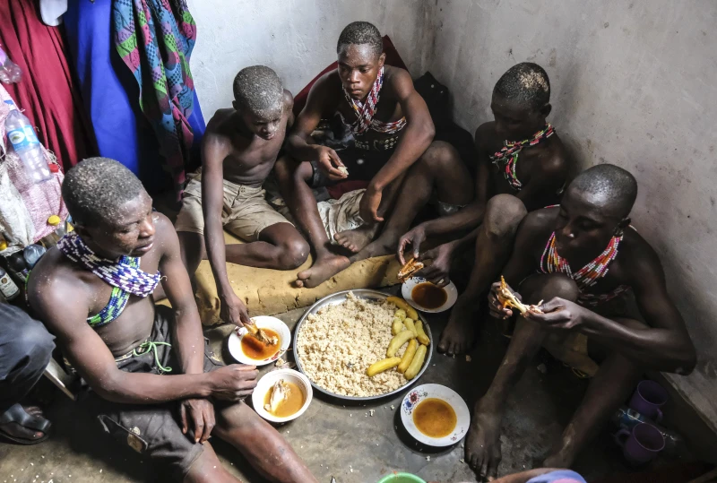 Young men, eat a meal prior to their traditional circumcision ritual, known as Imbalu, at Kamu village in Mbale, Eastern Uganda, Saturday, Aug. 3, 2024. (AP Photo/Hajarah Nalwadda)