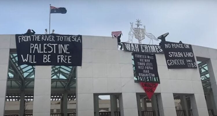 A small group of anti-Israel activists briefly took over the roof of Australia’s parliament building Thursday morning in a move condemned by the country’s prime minister as “reckless.”