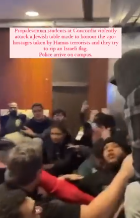 Anti-Israel students physically attack Jewish students at the @Concordia University in Montreal Canada for daring to put up a table with posters of Israeli kids kidnapped by Hamas.