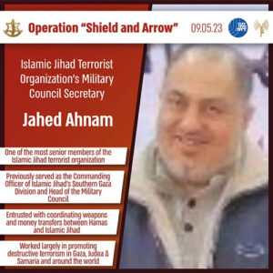 INN reported that Ahnam, 62, resided in Rafiah, and was one of the most senior members of the organization. He previously served in key positions in the terrorist organization including the Commanding Officer of the Islamic Jihads’ Southern Gaza Brigade and Secretary of the Military Council.