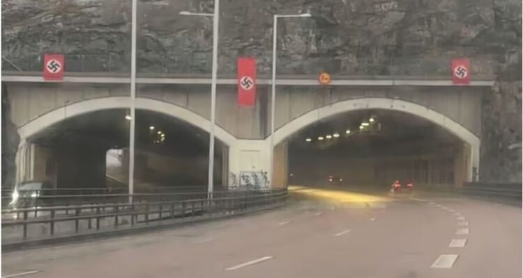 Three large Nazi flags were hung over a major highway in Sweden Sunday, shocking drivers.
