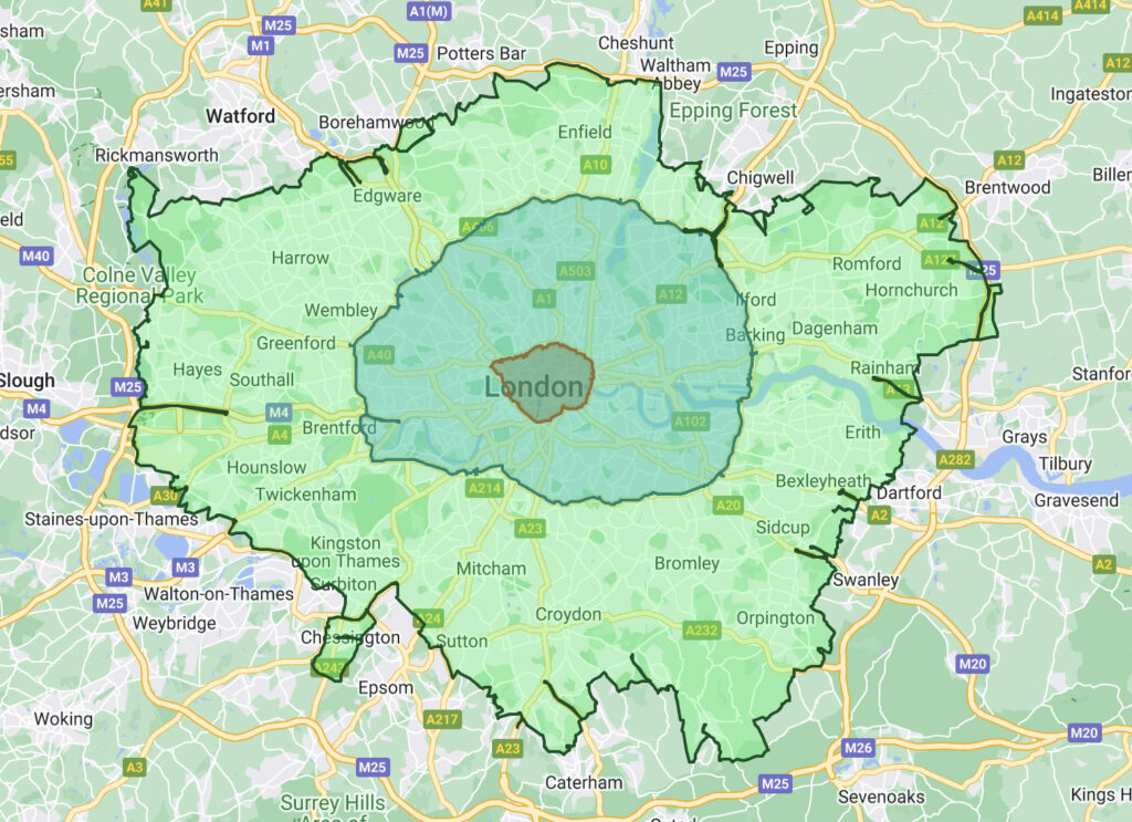 ย The dark green area represents the previous ULEZ, the bright green represents the expanded ULEZ that went into effect Tuesday.
