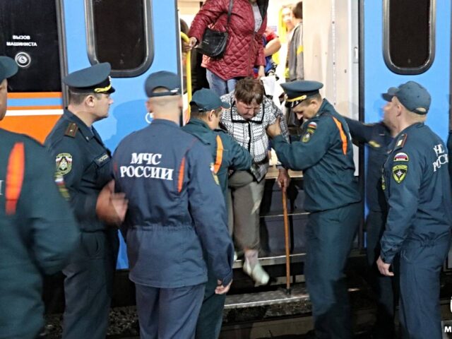 Employees of the Russian EMERCOM help the people, who are forced to leave the border settlements, as they have arrived from the Kursk region at a railway station in Oryol, Russia on August 9, 2024. Authorities organized temporary accommodation, food, medical and informational support for more than 80 people, which 24 of them are children. ( Russian Emergencies Ministry/Anadolu via Getty Images)