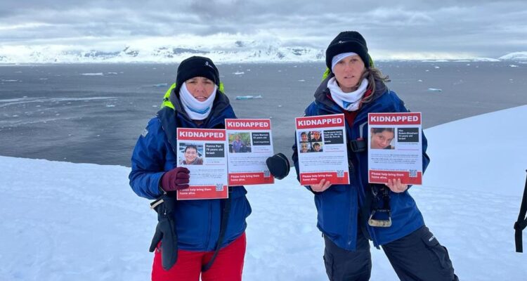Upon arriving in Antarctica, the Haifa University researchers posed for celebratory photos with the flags of Israel and their university. But then they posed for a more serious picture: holding posters of abducted Israelis.