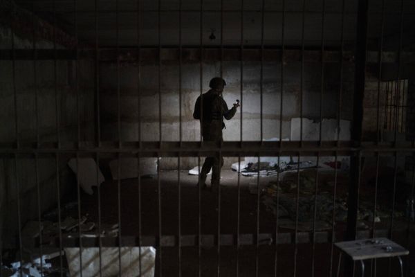 In a dank basement behind the local supermarket, metal bars cordon off a corner of the room to form a large cell. Dirty sleeping bags and duvets show three sleeping spots on top of sheets of Styrofoam for insulation from the damp earth floor. In the corner, two black buckets served as toilets.