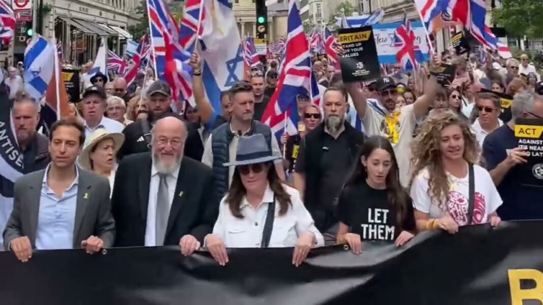 UK Chief Rabbi Ephraim Mirvis addressed the marchers with a stark message: “These are awful times. We have seen an explosion of hatred right across the UK. Antisemitism is rife right across the UK. You will see it. You will hear it. You will feel it. Britain, wake up now.”