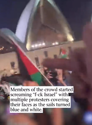 Moments after the blue and white colours of the Israeli flag lit up the Opera House sails, pro-Palestine members of the crowd started screaming “f–k Israel” and “f–k the Jews”. Israeli flags were also burned 👉 https://t.co/UCafNaEjfz pic.twitter.com/xJZKee6APB
