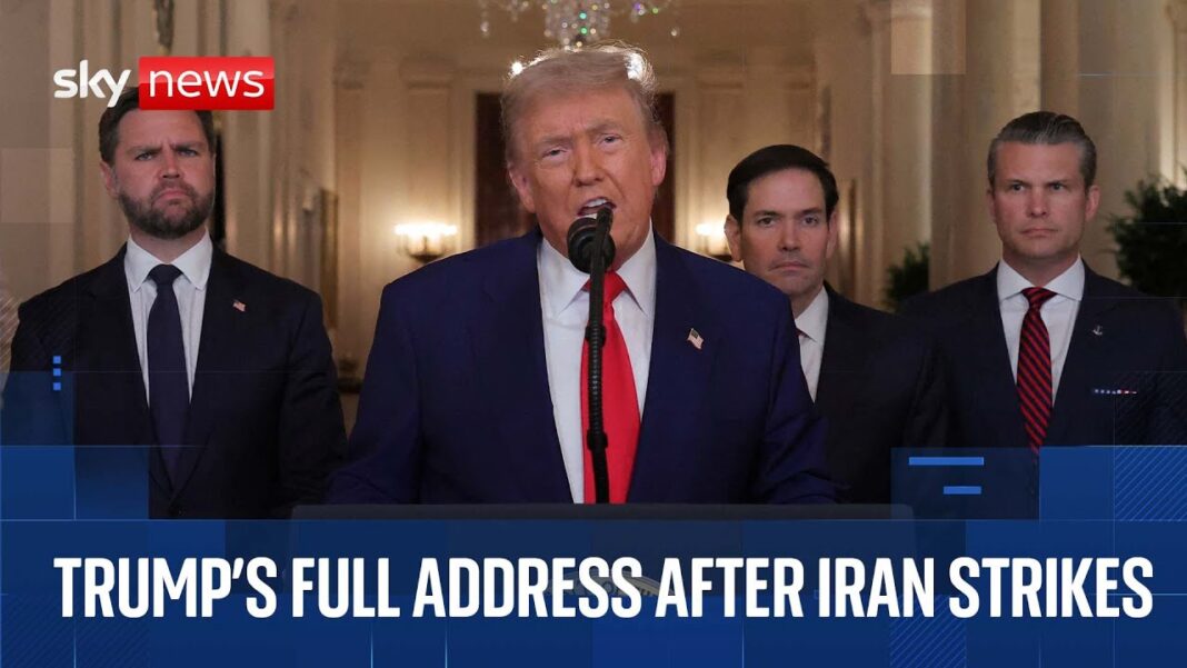 Trump’s address concluded with a note of resolve and patriotic fervor. “The program is now set back,” he said. “Most of their infrastructure is gone. And if peace does not come quickly, we will go after those other targets with precision, speed and skill. Most of them can be taken out in a matter of minutes.”