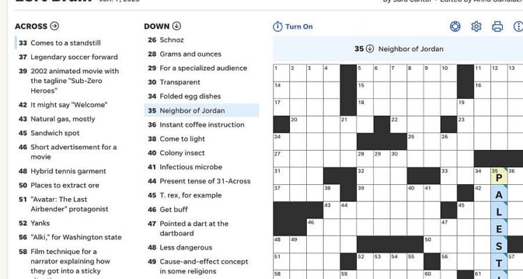 The clue for 35 down in the June 7 crossword was “neighbor of Jordan.” The nine-letter answer could not be Syria, Iraq, Saudi Arabia or Israel. When JNS clicked “reveal word” in the online puzzle, the provided answer was “Palestine.”