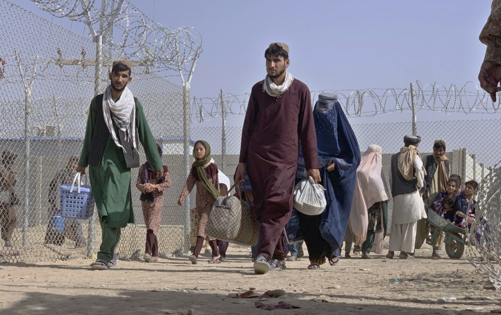Afghans walk through a security barrier as they enter Pakistan through a border crossing point in Chaman, Pakistan, Thursday, Aug. 26, 2021. Hundreds of Pakistanis and Afghans cross the border daily through Chaman to visit relatives, receive medical treatment and for business-related activities. Pakistani has not placed any curbs on their movement despite recent evacuations from Kabul. (AP Photo)