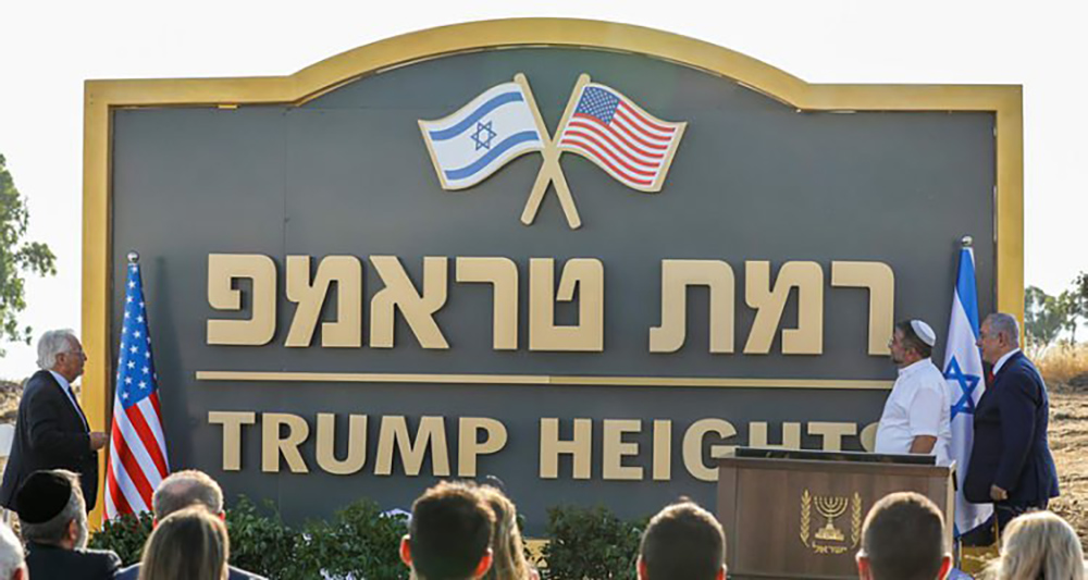 Friedman and Prime Minister Benjamin Netanyahu unveiled a huge sign, saying “Trump Heights” in both Hebrew and English, which was decorated with crossed Israeli and American flags.