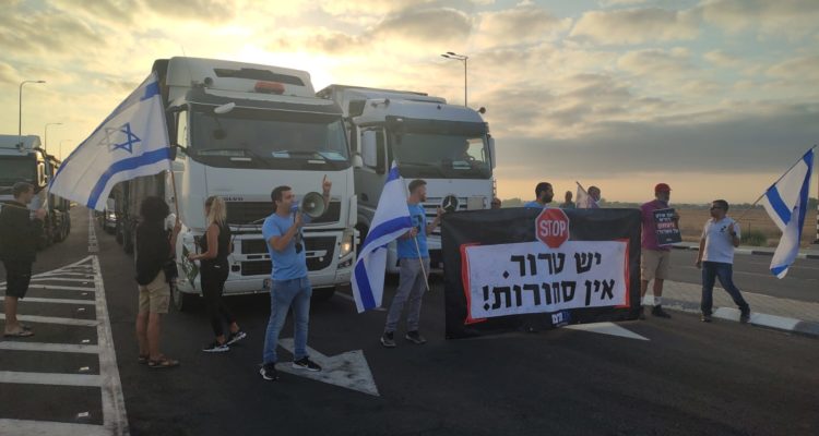 The activists blocked dozens of trucks bringing supplies to Gaza and chanted slogans including “If there’s terrorism, there are no supplies,” “The blood of our soldiers isn’t cheap,” and “Justice for Barel.”