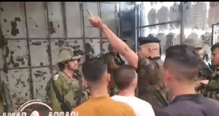 The Palestinian security officer raises his arm as if to banish the IDF troops and shouts at the soldiers to “get out of here! Out!”