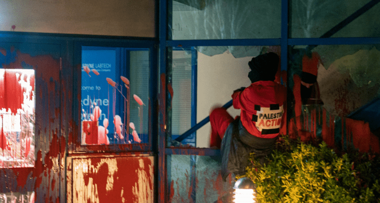 The UK-based Action for Palestine group attacked Teledyne Lab Ltd. last Thursday morning, at around 7:30 a.m. The factory is located in Presteigne, a small town on the border between Wales and England.