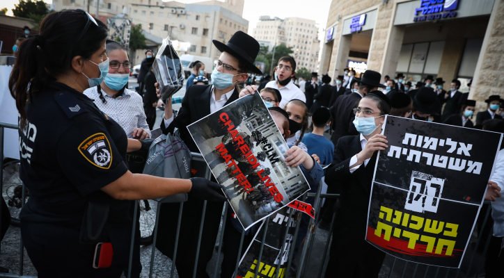 Police said one officer had been removed from duty after he was recorded punching a protester in the face after the haredi man asked the policeman why he was not wearing his mask. After being punched, police arrested the man, Yitzhak Bleyer, 22.