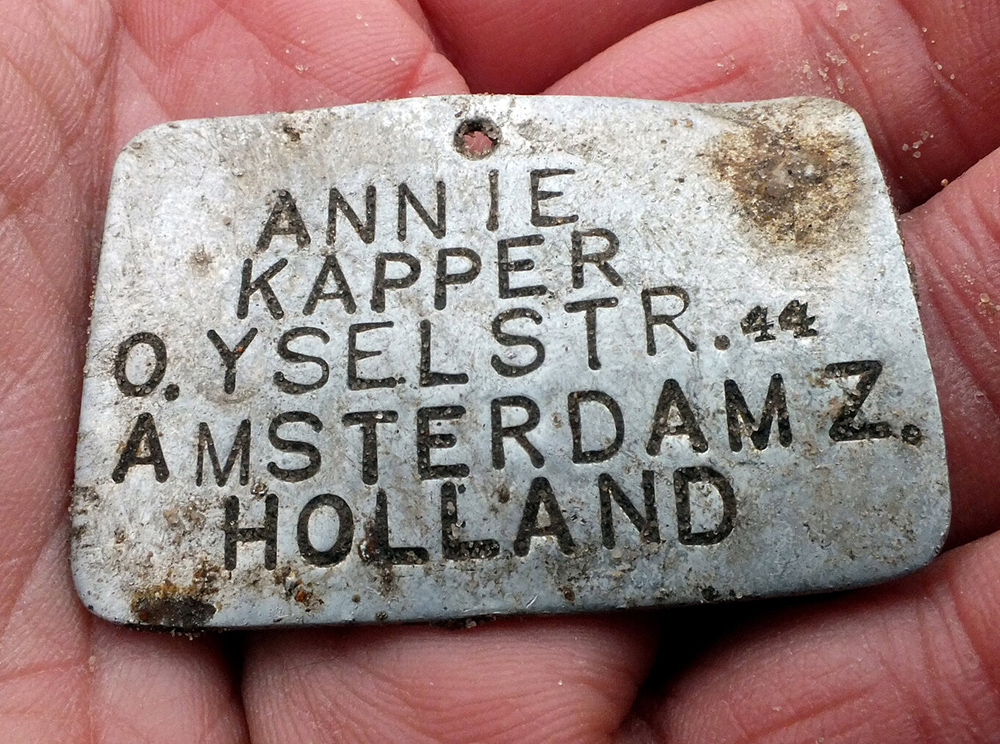 The tags, metal pendants worn around the children’s necks, belonged to four children aged 5–11 from Amsterdam, Holland. The tags bear their names, date of birth and addresses.