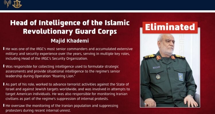 “We eliminated Majid Khadami, head of the intelligence organization of the Revolutionary Guards, one of those directly responsible for these war crimes and one of the three most senior officials in the organization,” Katz said.
