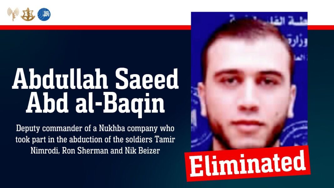 Israel National News (INN) reported on Wednesday that the Israel Defense Forces (IDF) and the Israel Security Agency (ISA) confirmed the targeted killing of Abdullah Saeed Abd al-Baqin, a senior Hamas operative who served as deputy commander of a Nukhba company in the Central Jabaliya battalion. The joint announcement, issued on Wednesday, stated that the precision strike occurred on August 7 and was the result of coordinated intelligence and operational planning between the two security bodies.