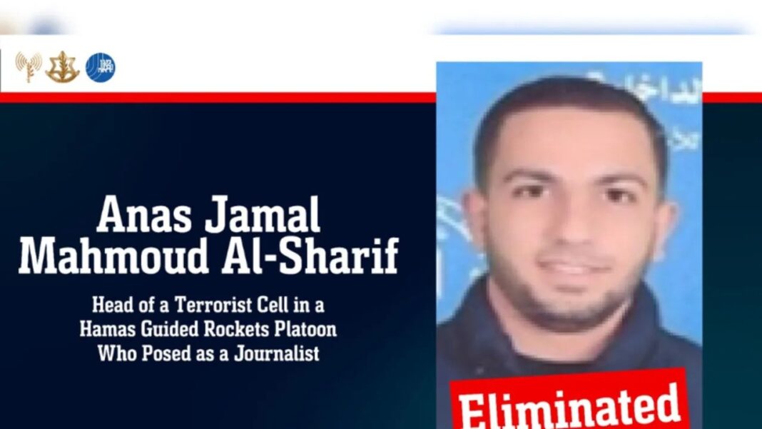 (A7) The IDF on Sunday night eliminated in Gaza City the terrorist Anas Al-Sharif, who posed as a journalist for the Al Jazeera network.