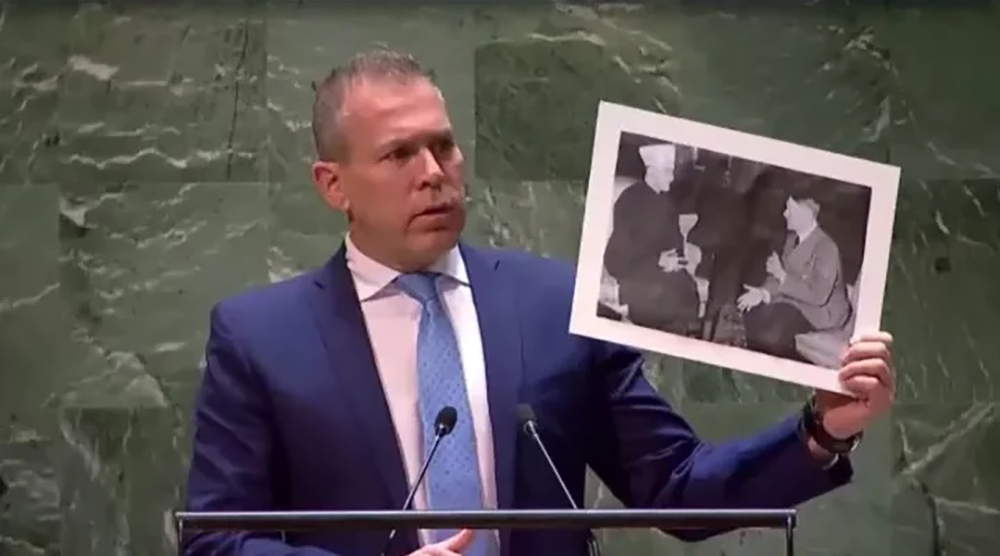 Israel’s Ambassador to the UN Gilad Erdan held up a picture of Hitler meeting with the Grand Mufti of Jerusalem during a UN Security Council debate on Palestinian statehood.