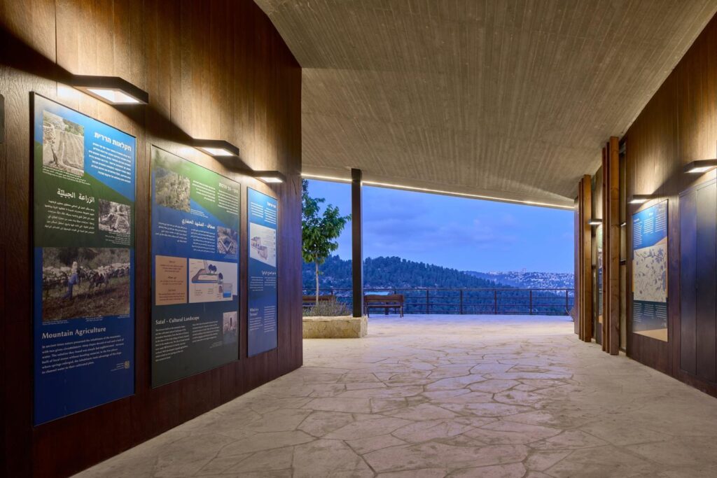 Inside the center, visitors will find visually engaging information panels along the corridor leading to the observation deck. These panels present details about KKL-JNF’s work, the uniqueness of the site, its ancient agricultural terraces, traditional crops, and hiking trail maps. All information is provided in Hebrew, Arabic, and English. An open-air classroom overlooking the panoramic view allows groups to gather for briefings before heading out on the trails. The entire site is fully accessible to visitors with disabilities.