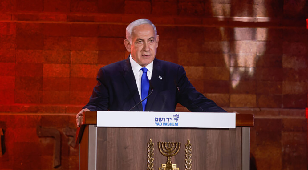 Prime Minister Benjamin Netanyahu called for unity and compared Iran to Nazi Germany in an address at the Yad Vashem Memorial marking Holocaust Remembrance Day on Monday evening.